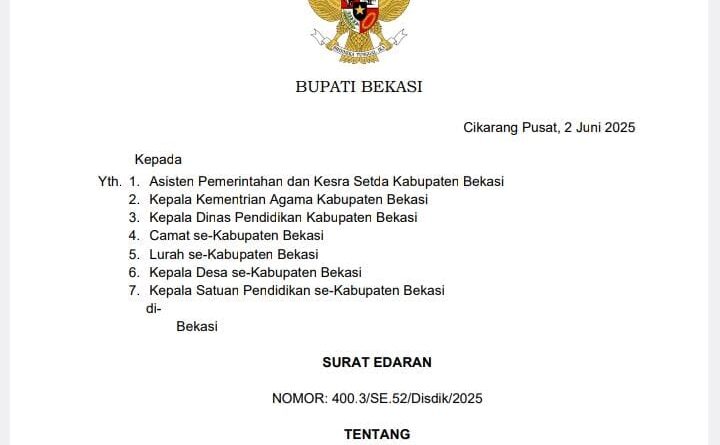 Surat tersebut dikeluarkan pada tanggal 2 Juni 2025 untuk ditujukan kepada kepala satuan pendidikan, kepala desa, Lurah, Camat, Kadisdik, Kepala Kantor Kemenag, serta Asda 1 Setda Kabupaten Bekasi.
